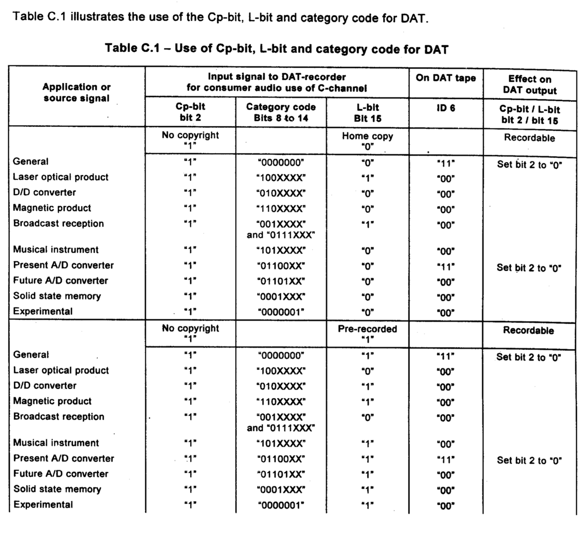 So, by its pressure Sony introduced Serial Copy Management System (SCMS) for DAT machines. It utilizes PCM sub-code area to store two bits: "Cp" (copy protected) and "L" (signal is an original medium) which prohibits to record second generation copies of the DAT tapes