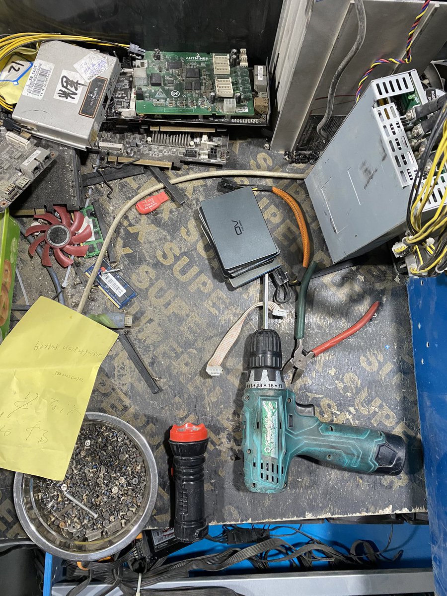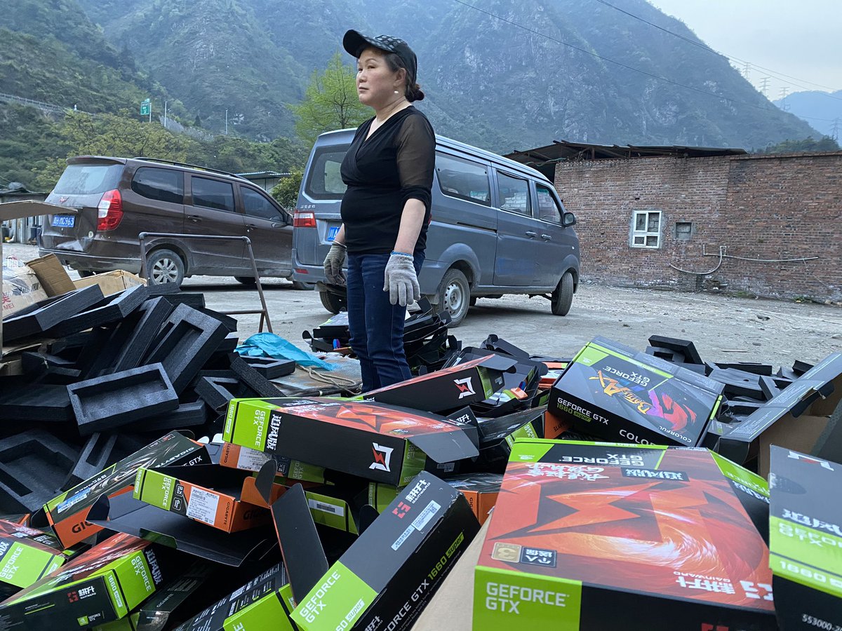 Dans l'atelier qui jouxte les entrepôts, Wang Guoqiang ne chôme pas : une centaine de cartes graphiques Nvidia viennent d'arriver. Armé de sa visseuse, il en assemble pour miner de l'#ethereum, autre monnaie virtuelle dont le cours s'est envolé #Bitcoin 6/