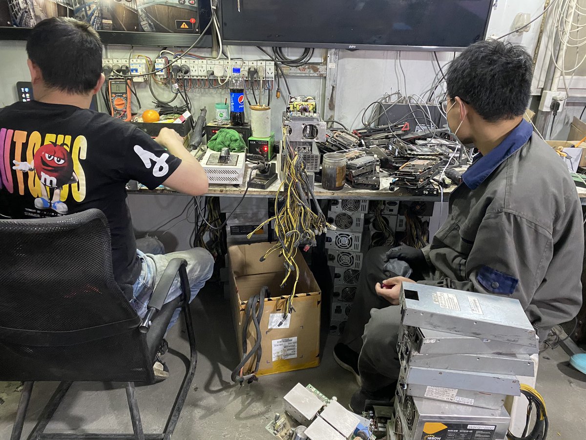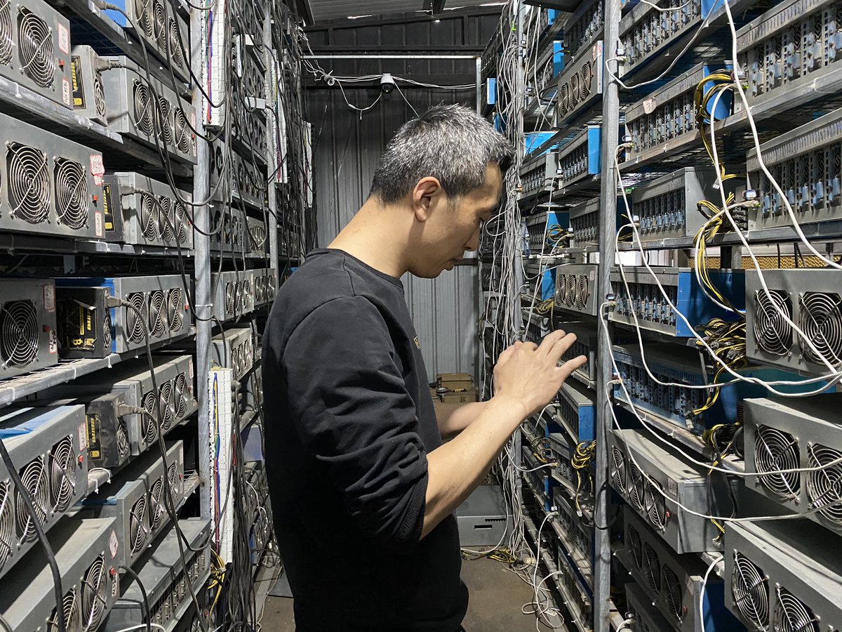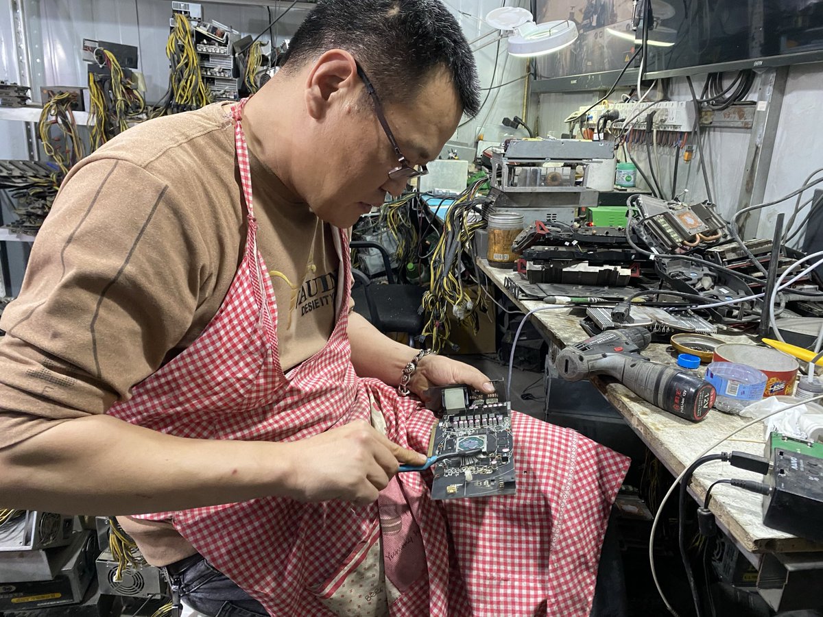 Muni d'une vieille brosse à dents, Dong Fengke nettoie délicatement une carte-mère. « Les poussières s'infiltrent dans les machines et peuvent provoquer une surchauffe », remarque-t-il. Un autre surveille les perf des machines directement sur son mobile. #Bitcoin 7/