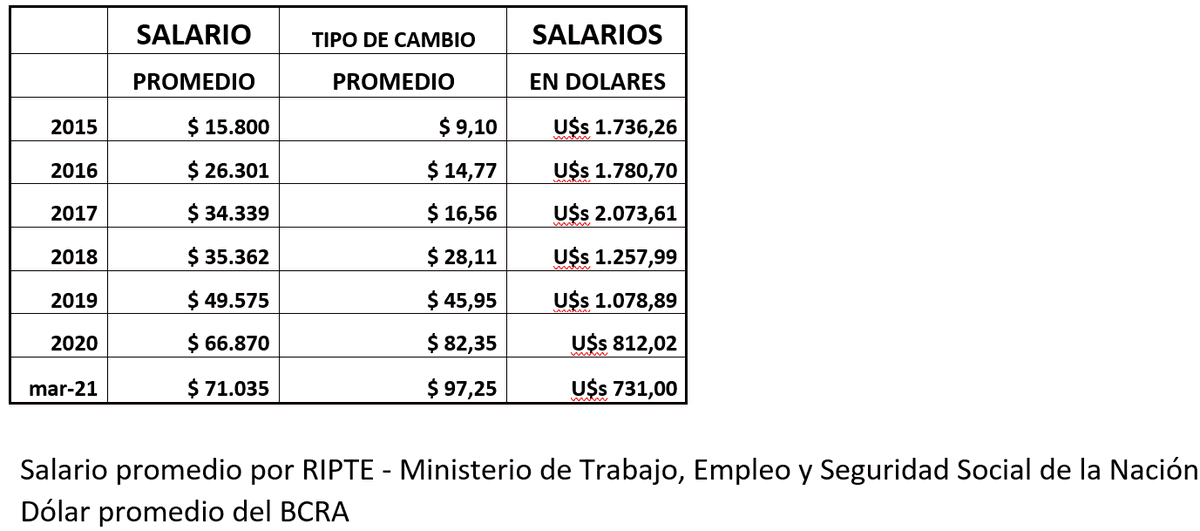 35. Al impulso de la inflación importada le sigue la agudización de la puja distributiva. Por lo general, los salarios reales caen. Salvando honrosas excepciones como los gobiernos de NK y CFK. El salario promedio en 2015 era USD 1.736, en 2019 caía a USD 1.078.