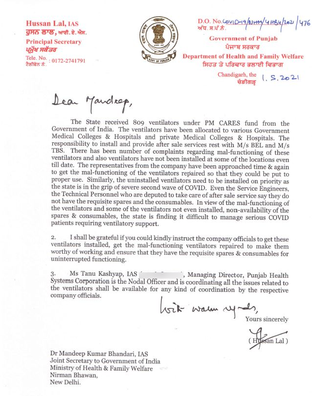 On 1st May, Punjab Government had written to the Ministry of Health and Family Welfare over the issue of 809 ventilators provided to the State under PM Cares Fund "not being installed and malfunctioning".