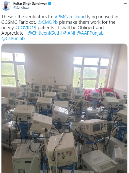 Punjab | AAP MLA from Kotkapura, Kultar Singh Sandhwan has alleged that ventilators supplied under PM Cares Fund are lying unused in Guru Gobind Singh Medical College and Hospital, Faridkot; urges Punjab CM Captain Amarinder Singh to take action