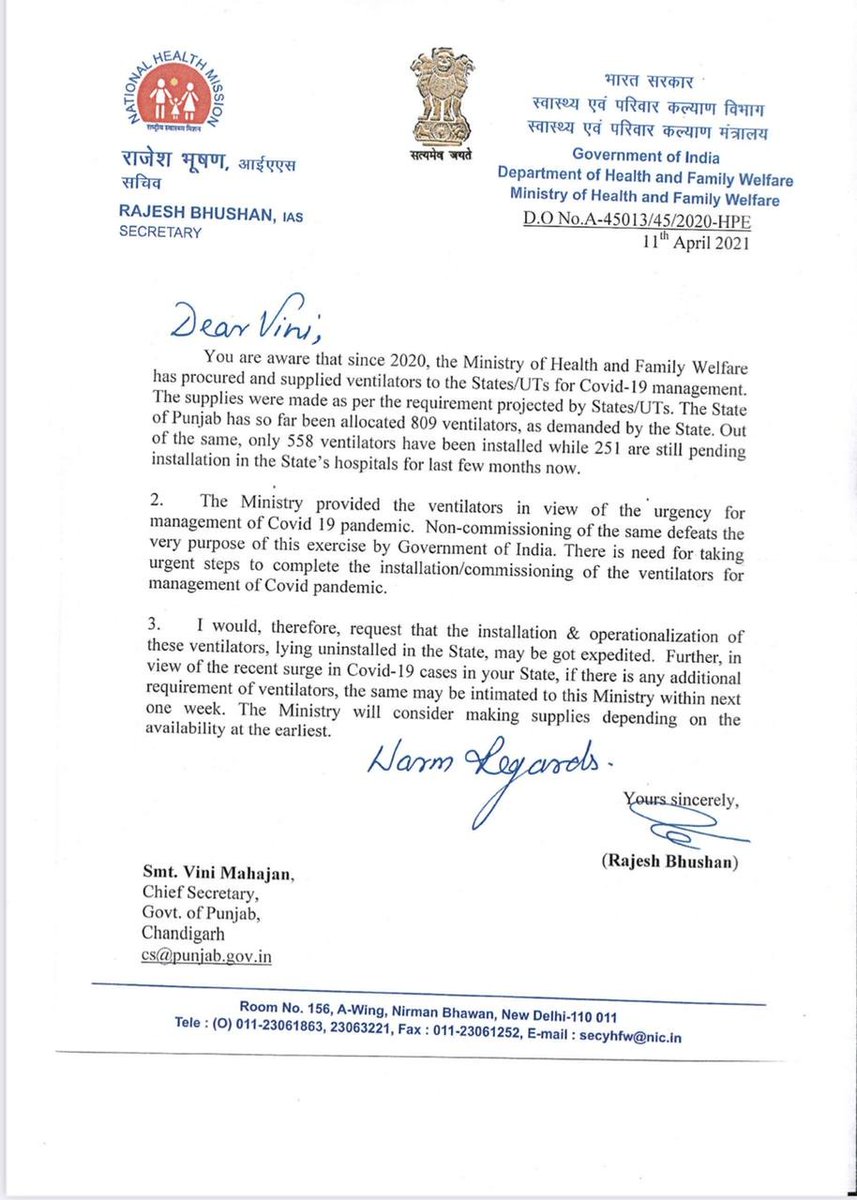 On April 11, the Ministry of Health wrote to the #Punjab Chief Secretary over the non-commissioning of ventilators provided to the State. The letter stated, "Punjab allocated 809 ventilators, out of the same, only 558 ventilators installed while 251 are pending installation."