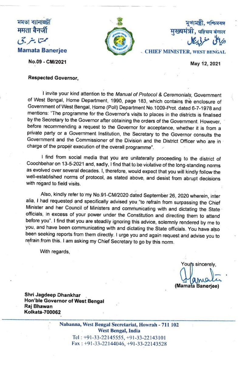 West Bengal CM Mamata Banerjee writes to Governor Jagdeep Dhankhar regarding his planned visit to Cooch Behar; says the visit is "violative of long-standing norms as evolved over several decades".