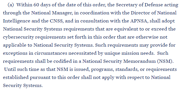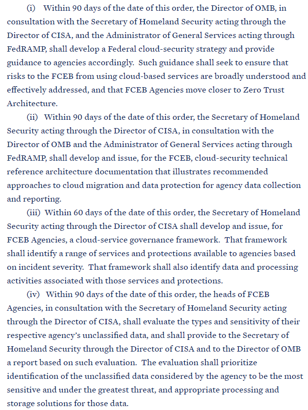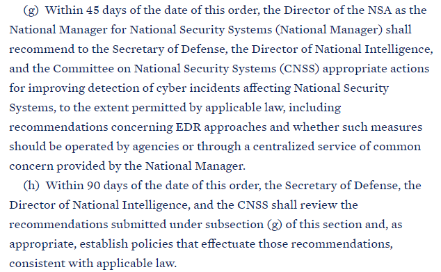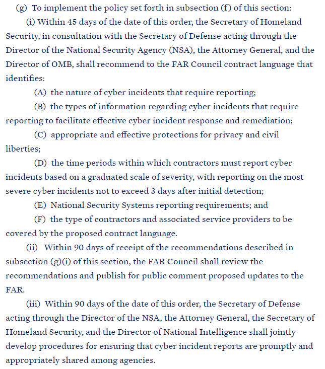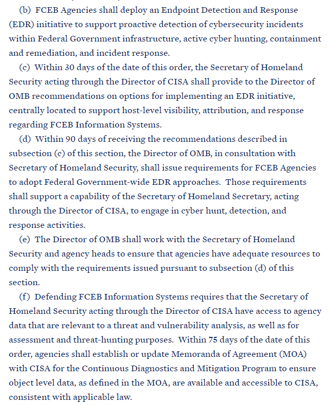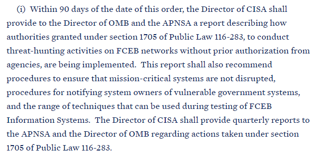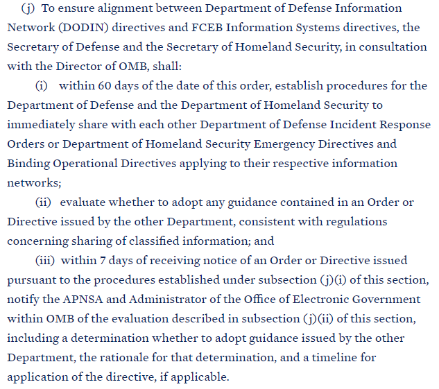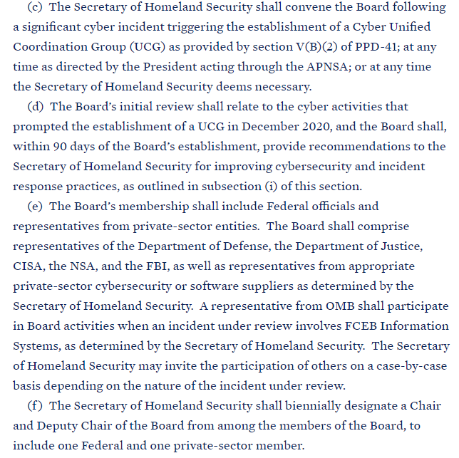 * Cyber Safety Review Board: composition (co-led by DHS and industry rep, includes DOD, DOJ, CISA, NSA, FBI), function (think NTSB), and initial reporting requirement (SolarWinds review)