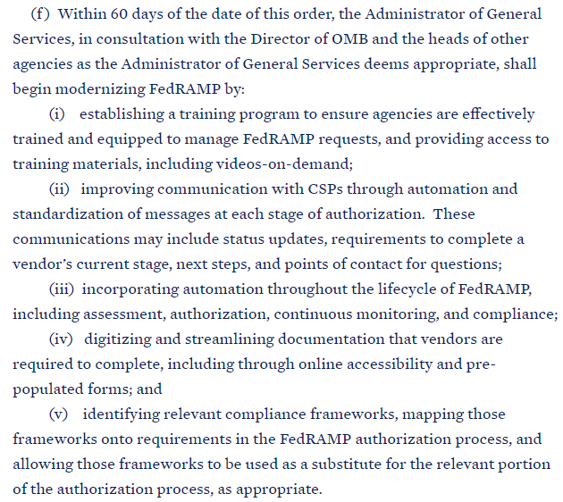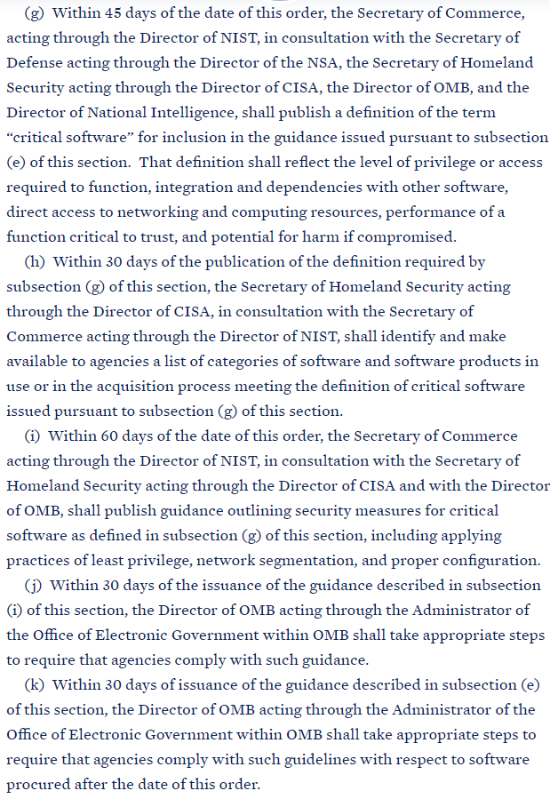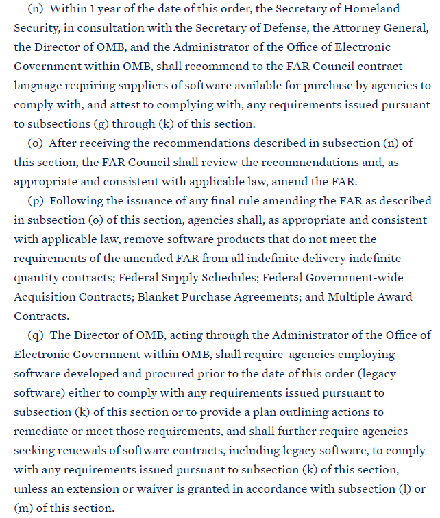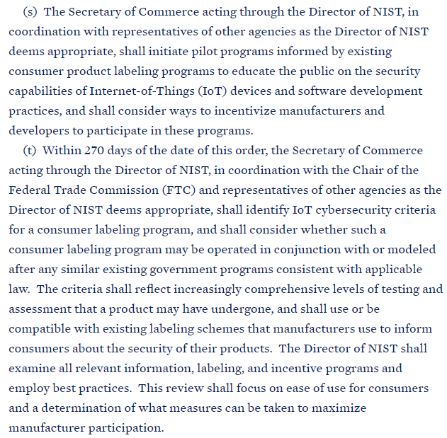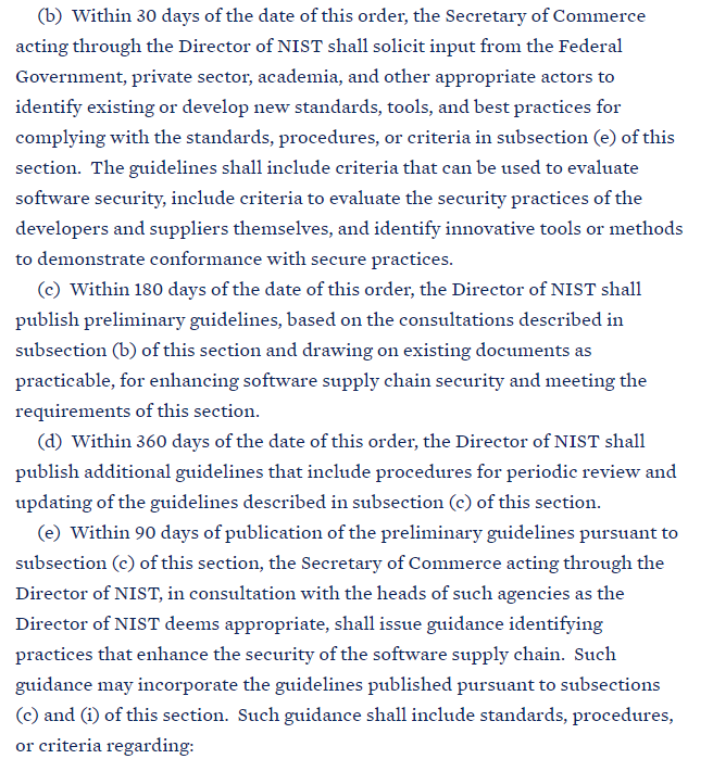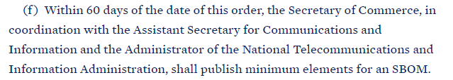 * Commerce must publish minimum reqs for software bill of materials (think ingredient list for software)