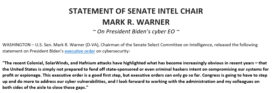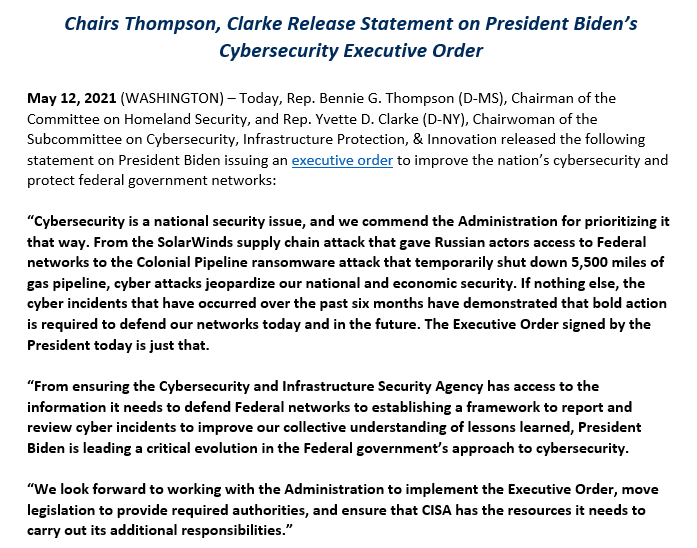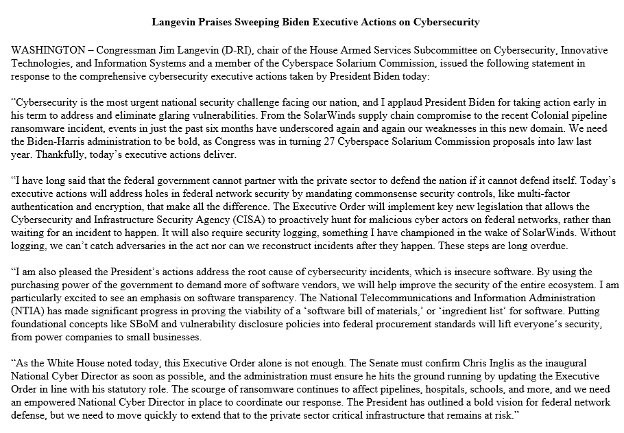 Leading cyber-focused lawmakers also praised Biden's EO, although several of them noted that it will not be enough and Congress has to act, too.