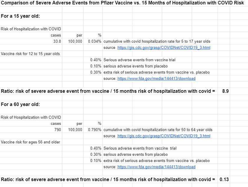 So the risk of serious adverse events from the vaccine is 8.9 times as big as the risk of hospitalization due to 15 months of covid exposure.