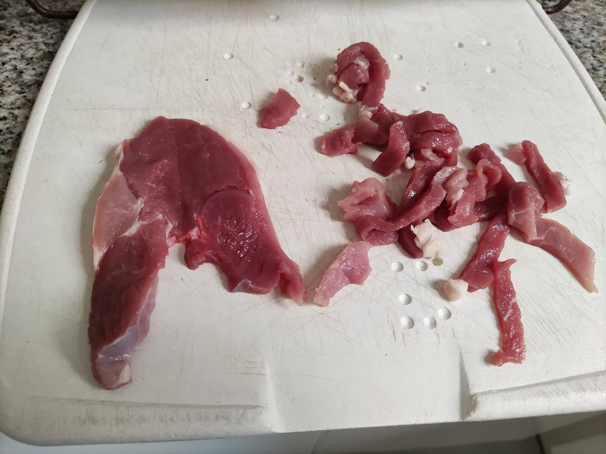 Nosotros en cada la cortaremos en tiras. Esto es muy importante, ya que si no el «efecto Shawarma» va a ser imposible. También aprovechamos para acabar de limpiar toda la.grasa y posibles huesecitos que se hayan colado.