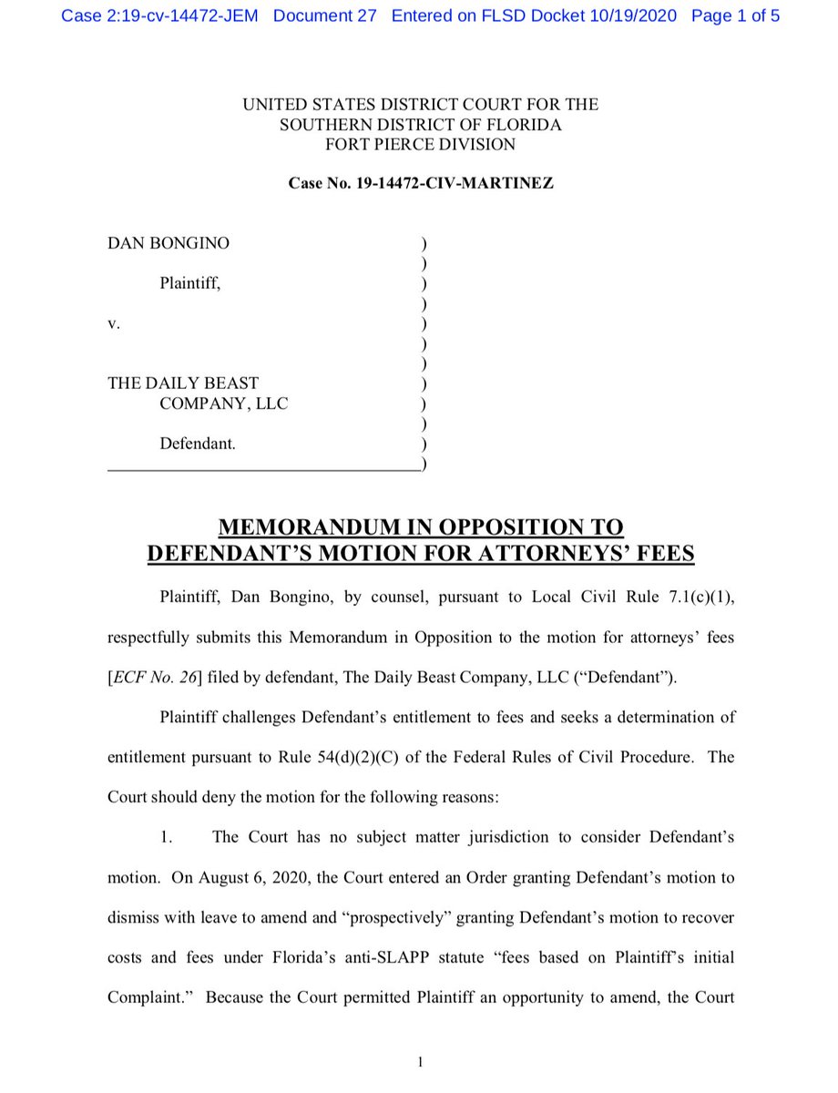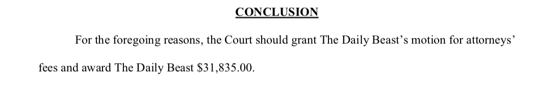 NEW: Yesterday, Fox News contributor Dan Bongino filed a motion refusing to pay the Daily Beast's attorney fees after losing in a defamation case. A judge previously ruled that Bongino must pay for the Beast's legal fees.