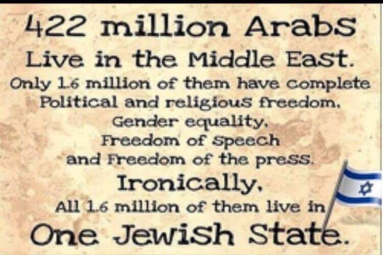 Well, Jews have no where else other than a slip of land i what is Jewish Judea, which we share with 20% of our Arab citizens, who are the most free in the Middle East & equals. Let me introduce you to them: