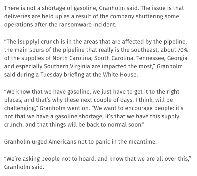 Americans at the pump are already starting to feel the cascading effects of the ransomware incident affecting Colonial Pipeline, analysts say, but Energy Secretary Jennifer Granholm is pleading w/ Americans to resist the urge to hoard gas. @CyberScoopNewscyberscoop.com/gas-panic-buyi…