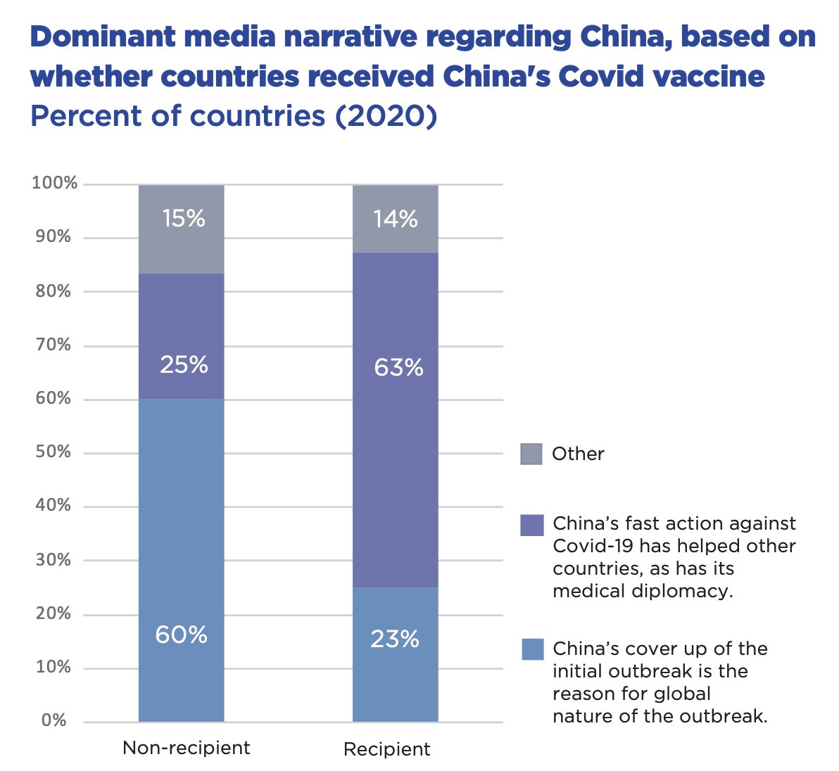 Segundo o relatório, países que recebem vacinas chinesas para a Covid-19 têm uma cobertura jornalística mais favorável a Pequim do que países que não recebem - estes tendem a focar em reportagens sobre o encobrimento da origem da pandemia em Wuhan.