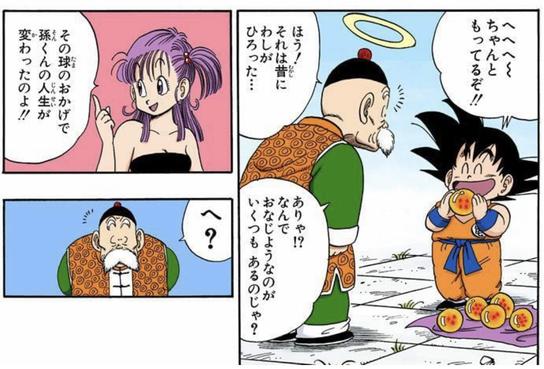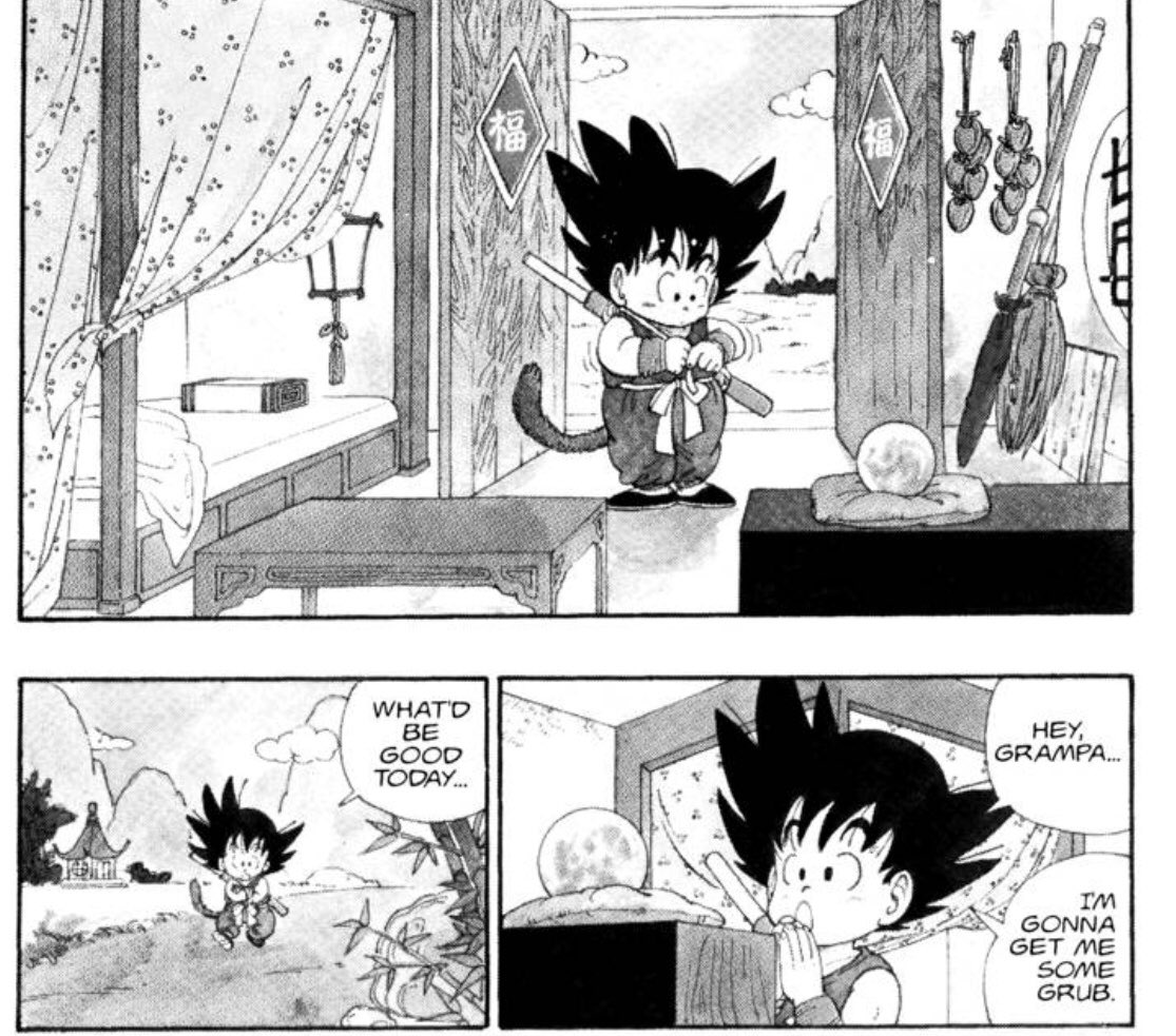 After this (surely the most tragic midnight potty trip in history), Goku is left all on his own up in the mountains, miles from civilization. He inherits Gohan’s magic staff, plus a weird ball Gohan found one day. Goku starts talking to this memento as if it were Gohan himself