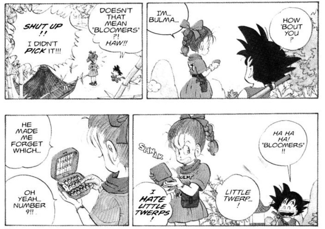 (Or so it seems from Goku’s reaction to Bulma’s name. Viz makes Goku’s comments more explicit, while in Japanese he merely calls it a “funny name”, so maybe he doesn’t actually know about Japanese gym shorts terminology)