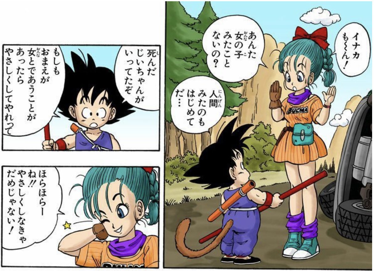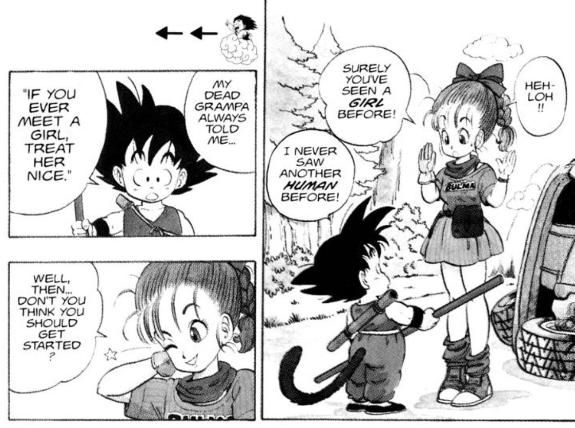 While Goku never saw another human when living with his grandfather, Gohan did tell him to treat women nicely. And though Gohan didn’t teach young Goku anything of female anatomy, he did apparently explain what “bloomers” are.