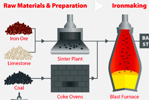 Iron ore is oxide (FE2O3) and for it to be converted to pure iron, oxygen needs to be removed. So Iron ore lumps and coking coal are burned together in the blast furnace to remove oxygen and make Iron. This is the Iron making process. (5/22)