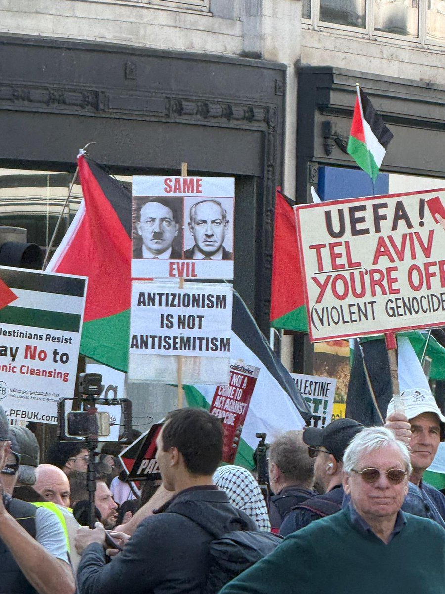 The "Palestinian Forum in Britain" is another player behind today's ugly scenes. Israel=Nazis.
