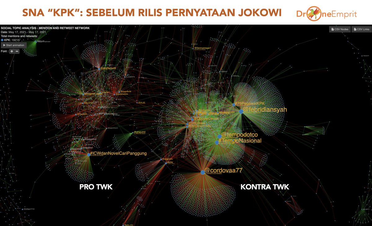Percakapan tentang "KPK" pada 17 Mei 2021 hingga pukul 3 sore, memperlihatkan ada 2 cluster yang Pro TWK dan yang Kontra TWK (plg besar).