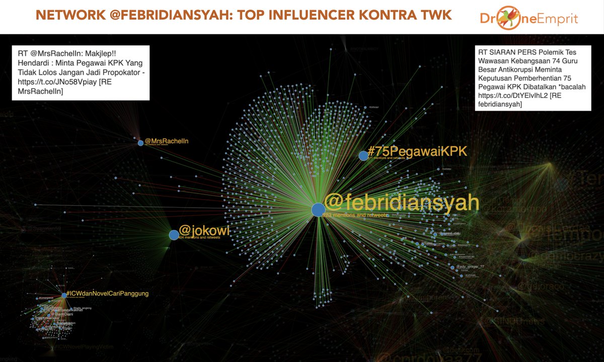 Sub network (ego-network) yang berpusat pada akun @jokowi memperlihatkan link dengan akun @febridiansyah, top influencer Kontra TWK. Responsenya berupa "hope" agar pemberhentian 75 pegawai bisa dibatalkan dengan dukungan pernyataan ini.