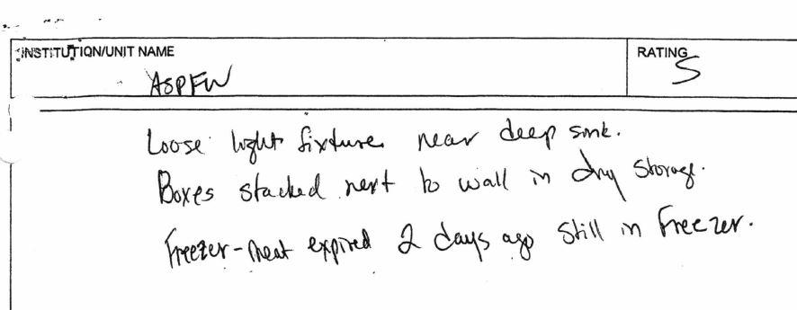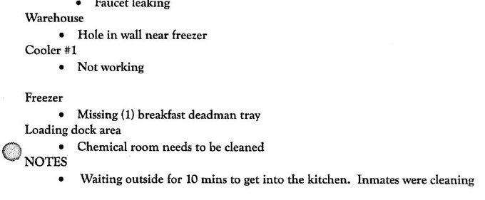 "Waiting outside for 10 mins to get into the kitchen,” an inspector wrote. “Inmates were cleaning."
