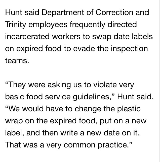 .@jalexandriahunt told me she was repeatedly ordered to cook with expired food at the Perryville prison, and instructed to put false expiration dates on ingredients in order to deceive kitchen inspectors: