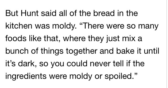 Hunt said despite the conditions, "They would give us a ‘satisfactory’ even if they found dead rats. It was like there was a camaraderie between the inspectors and the Trinity employees and the prison employees. So even if the kitchen was a mess, they’d let us get away with it.”