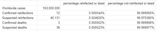 Globally there are 72 confirmed re-infections of covid, out of over 163 million cases. 3 confirmed deaths.