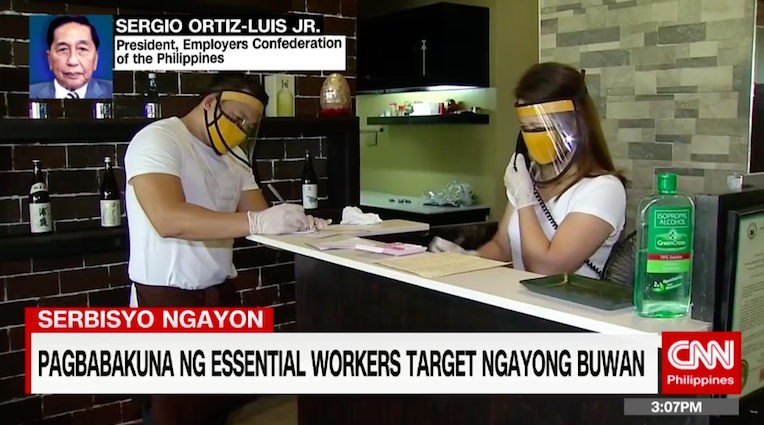 ECOP President Sergio Ortiz-Luis on vaccination of essential workers: It's a welcome development. Maraming kumpanya ang bumili ng sarili nila, gusto nila magkaroon ng priority sa bakuna. Marami ring private companies na worried dahil nade-delay ang dating ng mga bakuna