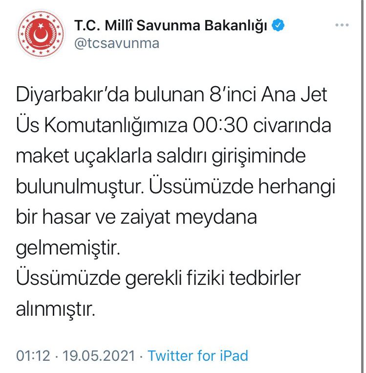 İçişleri Bakanı Soylu: "Diyarbakır’da bir askeri tesise 2 maket uçakla saldırı teşebbüsünde bulunulmuş, maket uçaklar etkisiz hale getirilmiştir. Herhangi bir zaiyat yoktur."