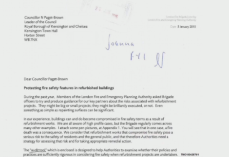 It suggested the use of an 'audit tool' to assess whether "policies and practices are sufficiently rigorous in considering fire safety". By this point, Grenfell Tower refurbishment was underway. Paget-Brown sent letter to planning department but not refurbishment team.