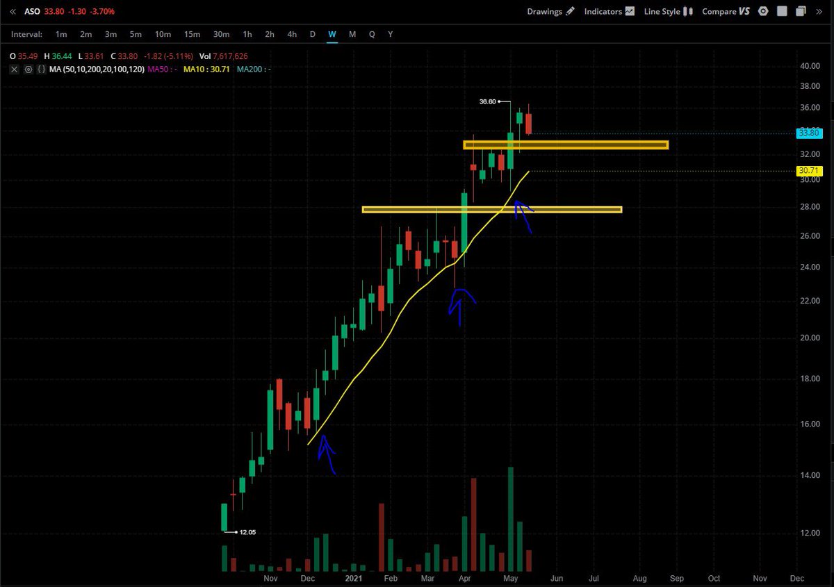 👉🏼 En velas semanales podemos ver como lleva una tendencia alcista muy pronunciada respetada por la media de 10 semanas, de la que se encuentra un poco separado; por lo que no sería extraño visitarla.