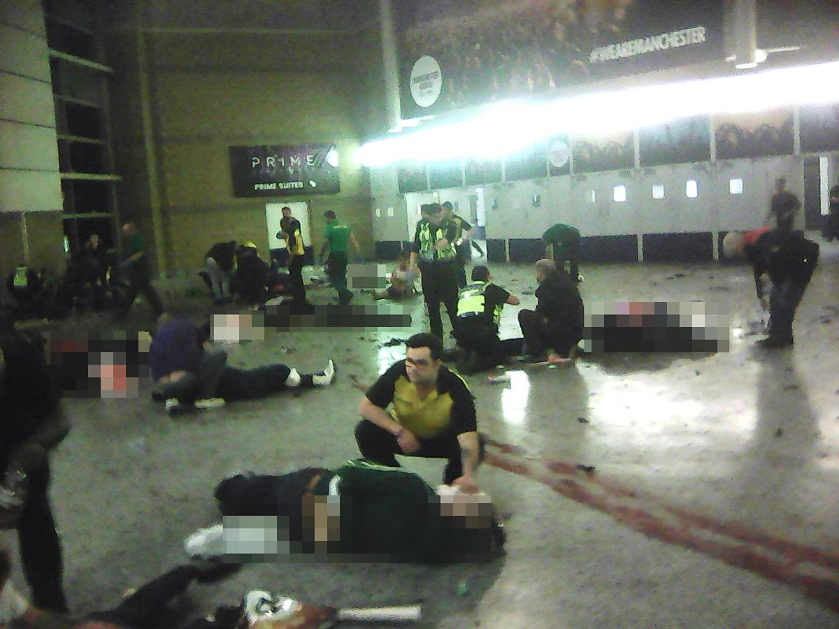 Händelse: Salman Abedi, en islamistisk självmordsbombare detonerar en sprängladdning vid en Ariana Grande-konsert på Manchester Arena.