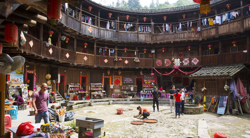 En las montañas subtropicales del sureste de China, en la región de Fujian, se levantan unas curiosas casas-fortaleza, completamente cerradas al exterior, pero abiertas a un gran patio central, normalmente circular.