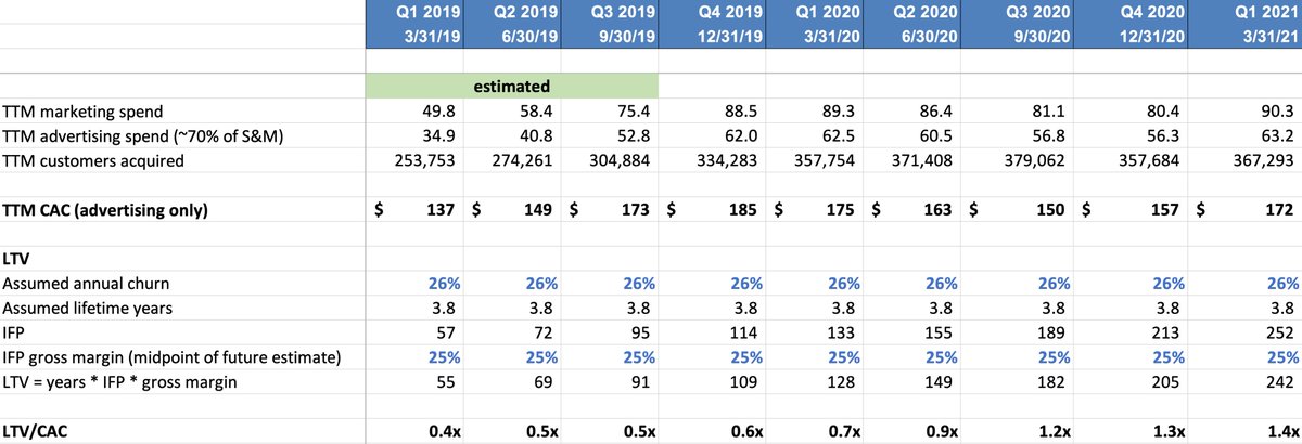 Lemonade $LMND LTV/CAC calculation. First, let's look at TTM LTV and gross profit per customer. Gross profit margin is running ~18-20%. I'm assuming ~70% of S&M spend for advertising: