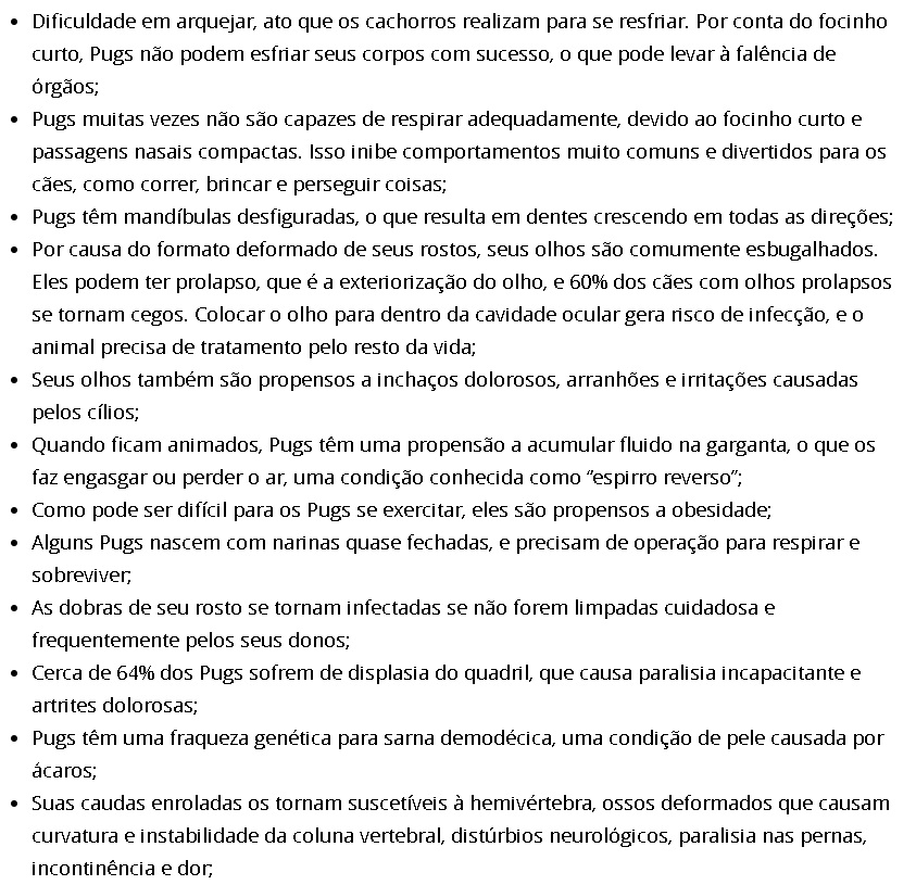 história? simples, a própria fisionomia do Pug é algo que nunca seria aceito em um meio natural, vamos começar pelo óbvio, Pugs possuem um crânio achatado, o que comprime suas vias aéreas e dificulta a respiração, levando mais estresse e pressão ao sangue, por isso mesmo que