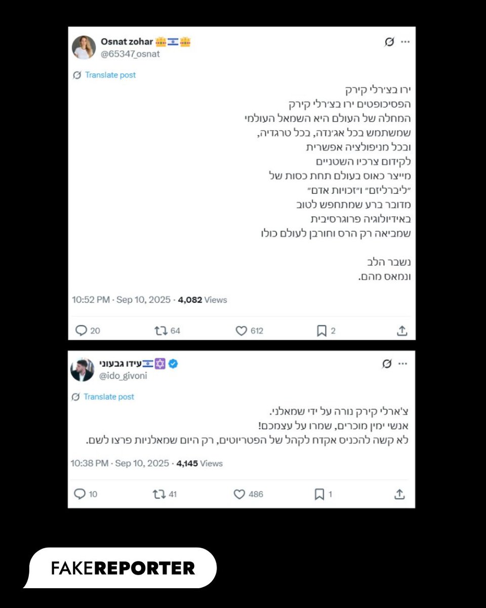 זה לקח כמה דקות. מיד אחרי הירי בצ'ארלי קירק, ובזמן שחקירת הרצח רק החלה, משפיענים ופוליטיקאים בישראל כבר מיהרו לנצל את האירוע לרווח פוליטי. הם החליטו מי היורה, הפיצו מידע כוזב לגביו, ומיהרו לקשור אותו למחאה נגד הממשלה. בלי ראיות, בלי חקירה ועם כוונה ברורה לקבע נרטיב. כך זה נראה >