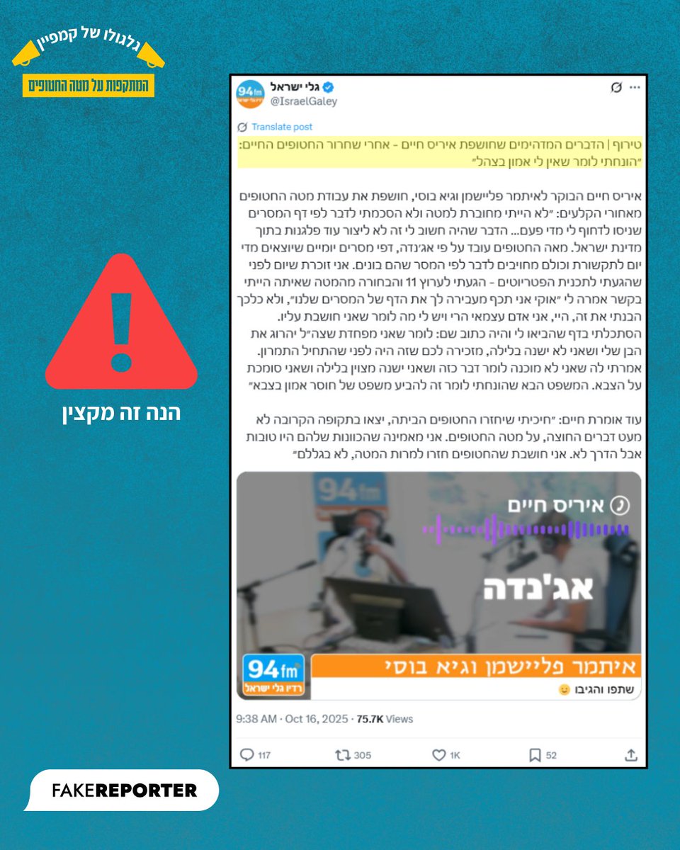 3. בבוקר ה-16/10 השיח נגד מטה החטופים עלה בחדות. האם השכולה איריס חיים התראיינה לרדיו גלי ישראל, המזוהה עם תומכי הממשלה, ותקפה בחריפות את מטה המשפחות. חיים טענה שמטה החטופים ניסה להכתיב לה דפי מסרים שמביעים חוסר אמון וחשש מפעולות צה"ל בעזה.