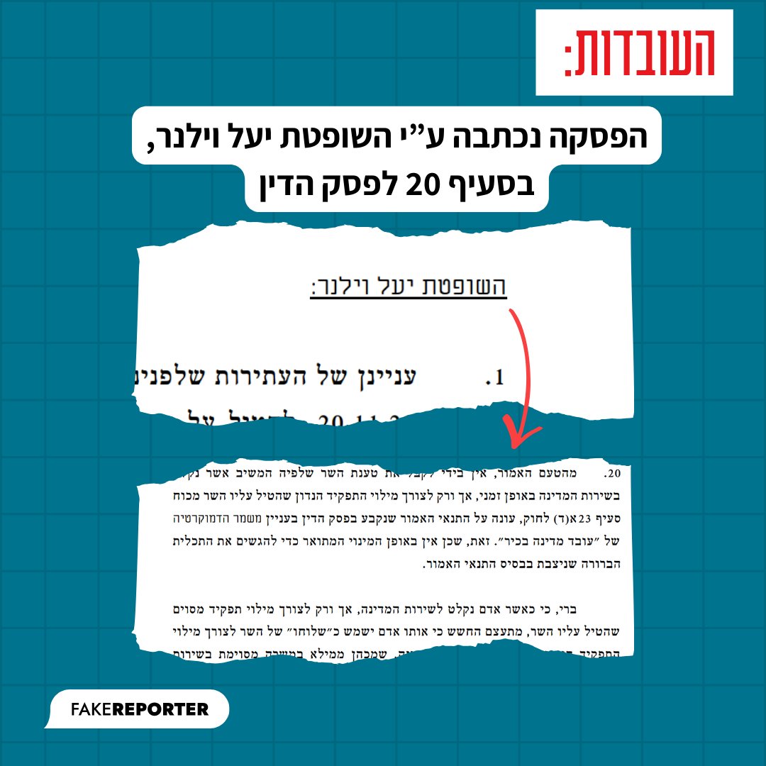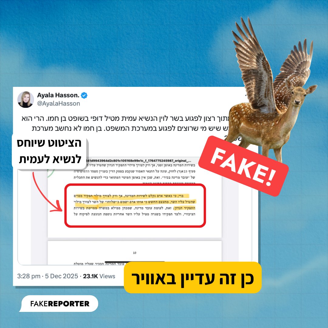 2. ב-5.12 נפל דבר: מגישת חדשות בשידור הציבורי פרסמה בחשבון שלה פייק מוחלט. לא אי-דיוק או מניפולציה, אלא בדיה מוחלטת. היא ייחסה ציטוט מפסיקת בג"ץ לנשיא עמית, כשבפועל כתבה אותו השופטת וילנר.