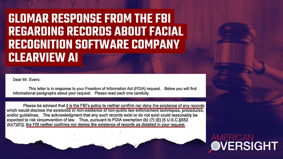 In June 2020, the FBI also said it would neither confirm nor deny the existence of records regarding the facial recognition software company Clearview AI, Inc. americanoversight.org/document/gloma…