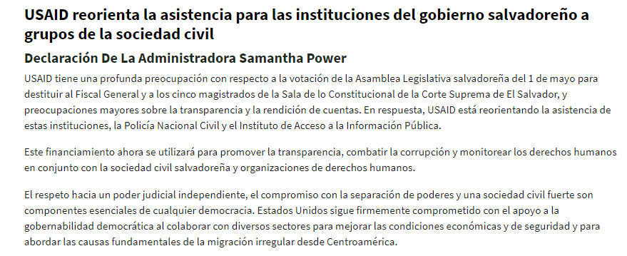 #ElSalvador | USAID indica que la asistencia destinada a CSJ, IAIP, PNC y FGR "ahora se utilizará para promover la transparencia, combatir la corrupción y monitorear los derechos humanos en conjunto con la sociedad civil salvadoreña y organizaciones de derechos humanos".
