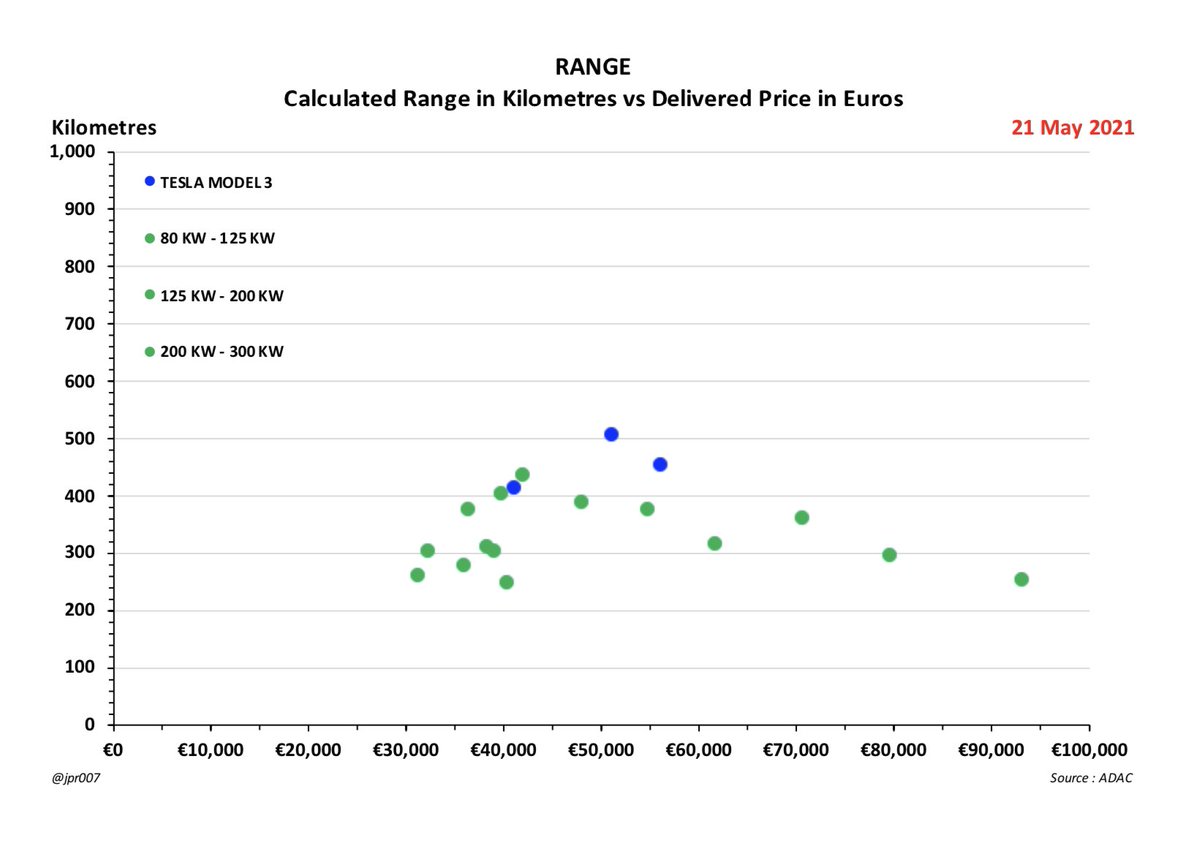 The biggest effect of this shows up in the kilometre Range of the sample vehicles
