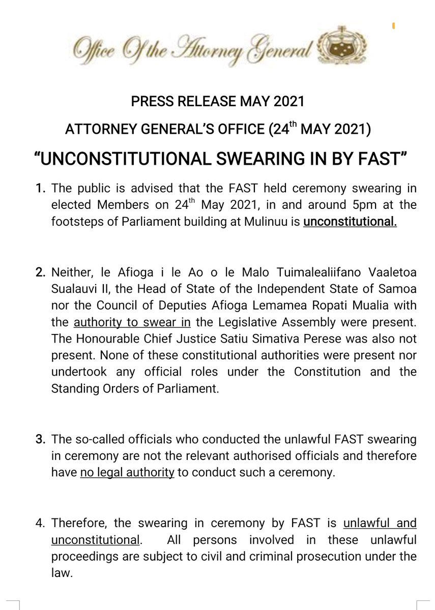 🇼🇸 La Fiscal General publica un comunicado: “Se advierte al público que la ceremonia de juramentación de los miembros electos de FAST es inconstitucional. Por lo tanto, todas las personas involucradas en estos procesos ilegales están sujetas a enjuiciamiento civil y penal”