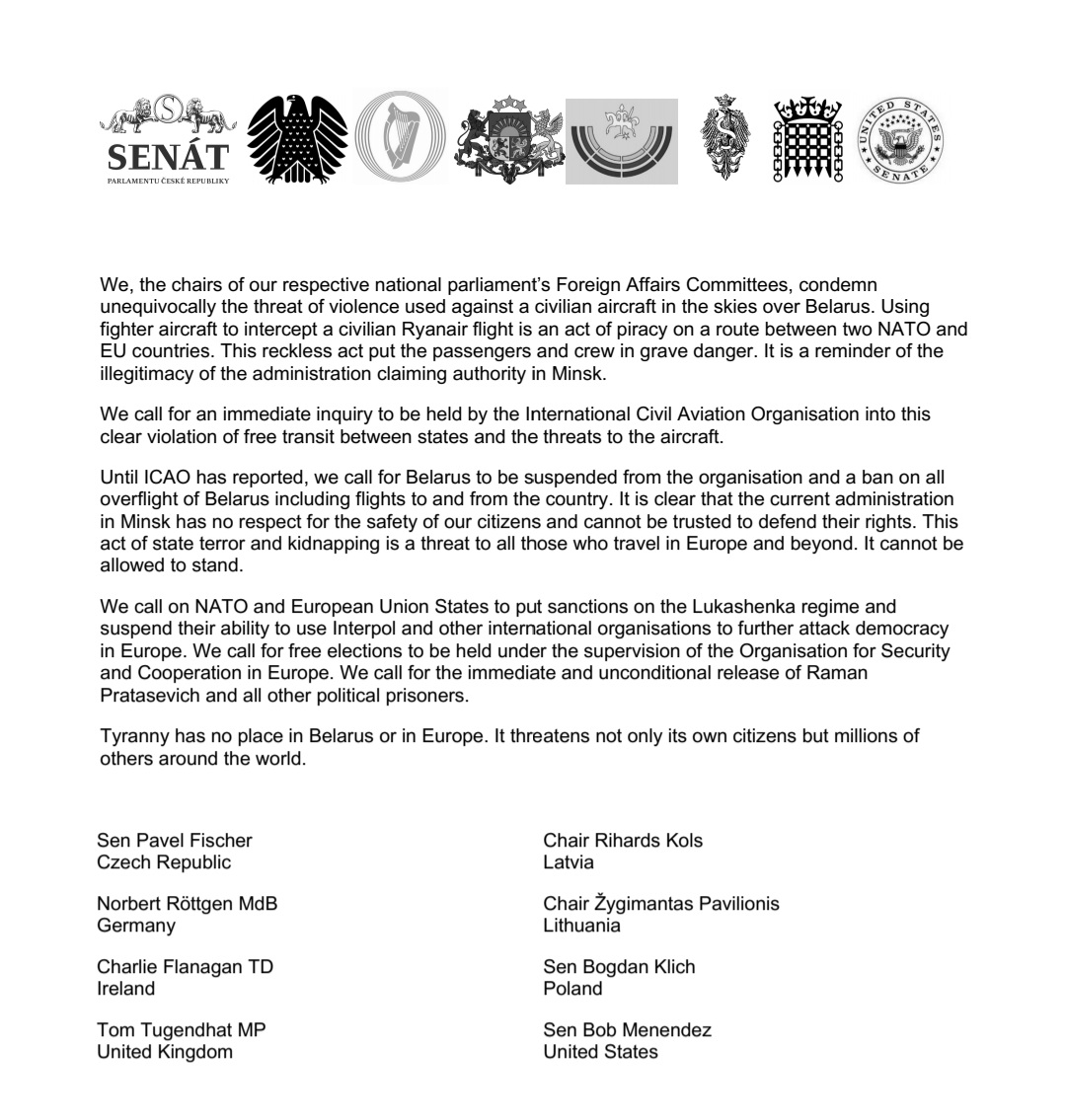 🇨🇿🇱🇻🇱🇹🇵🇱🇮🇪🇬🇧🇺🇸🇩🇪-🇧🇾 Representantes de los Comités de Exteriores parlamentarios condenan "la amenaza de violencia utilizada contra un avión civil en los cielos de Belarús" y piden: