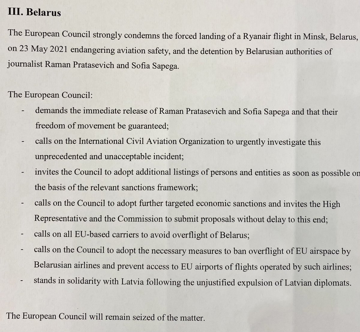 🇧🇾🇪🇺 Mañana se discutirá el incidente del avión de Ryanair en el Consejo Europeo.