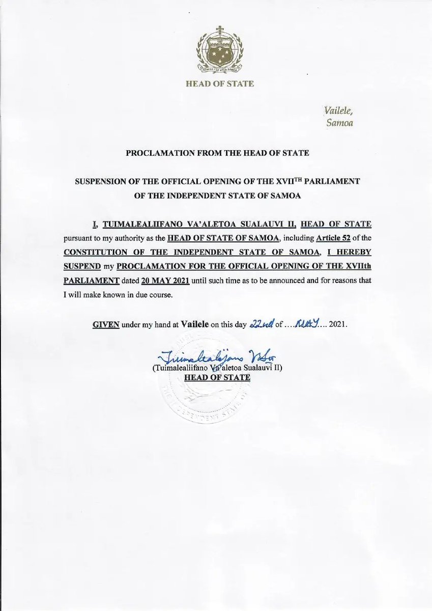 El «O le Ao o le Malo» (Jefe de Estado), Tuimalealiifano Va'aletoa Sualauvi II, suspende la reunión de la nueva Asamblea Legislativa que debía elegir nuevo gobierno tras las elecciones de abril, desafiando así la decisión del Tribunal Supremo.