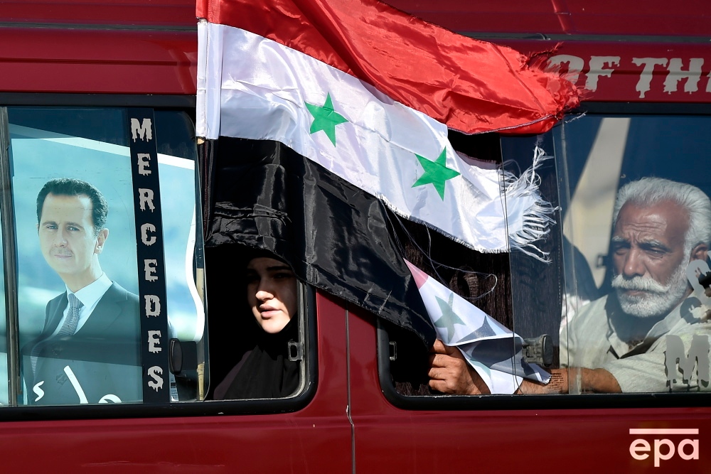 🇱🇧🇸🇾 Ciudadanos sirios en Líbano llevan una foto del presidente sirio Bashar Assad y la bandera nacional en un autobús cerca de la embajada siria mientras se dirigen a votar en las elecciones presidenciales.
