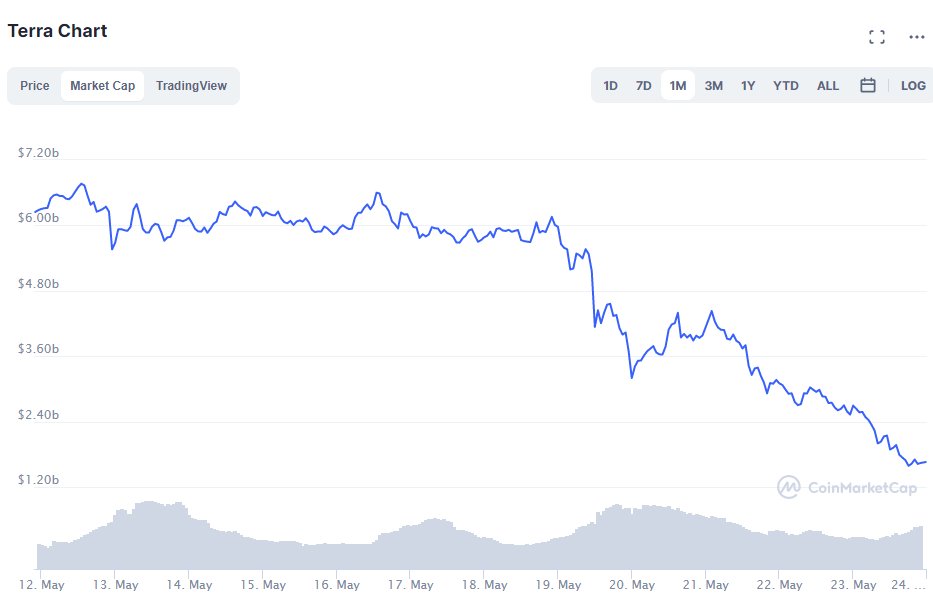 The Terra UST stablecoin could collapse in a bank run effect. UST is backed by an endogenous collateral Luna. Current Luna marketcap has fallen to arguably < outstanding UST. We are now in a dangerous spiral: as users panic out of UST, this reinforces the Luna crash further.