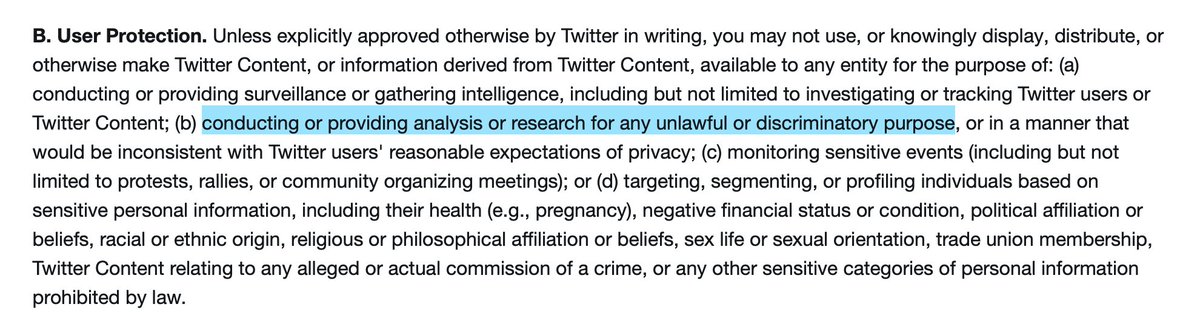 "you may not use…information derived from Twitter Content [for] …conducting or providing analysis or research for any unlawful or discriminatory purpose, or in a manner that would be inconsistent with Twitter users' reasonable expectations of privacy