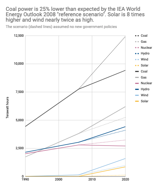Gas, hydro, wind and solar all significantly outperformed the IEA's reference scenario expectations from 2008, whereas nuclear and coal were lower